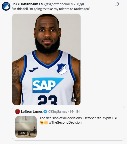 而德甲霍芬海姆也借机在社媒玩了一把梗。他们的英文社媒账号晒出詹姆斯身穿霍芬海姆球衣的P图照片,并配文道:“这个秋天,我将把天赋带到克莱希高(霍芬海姆所在地)。”