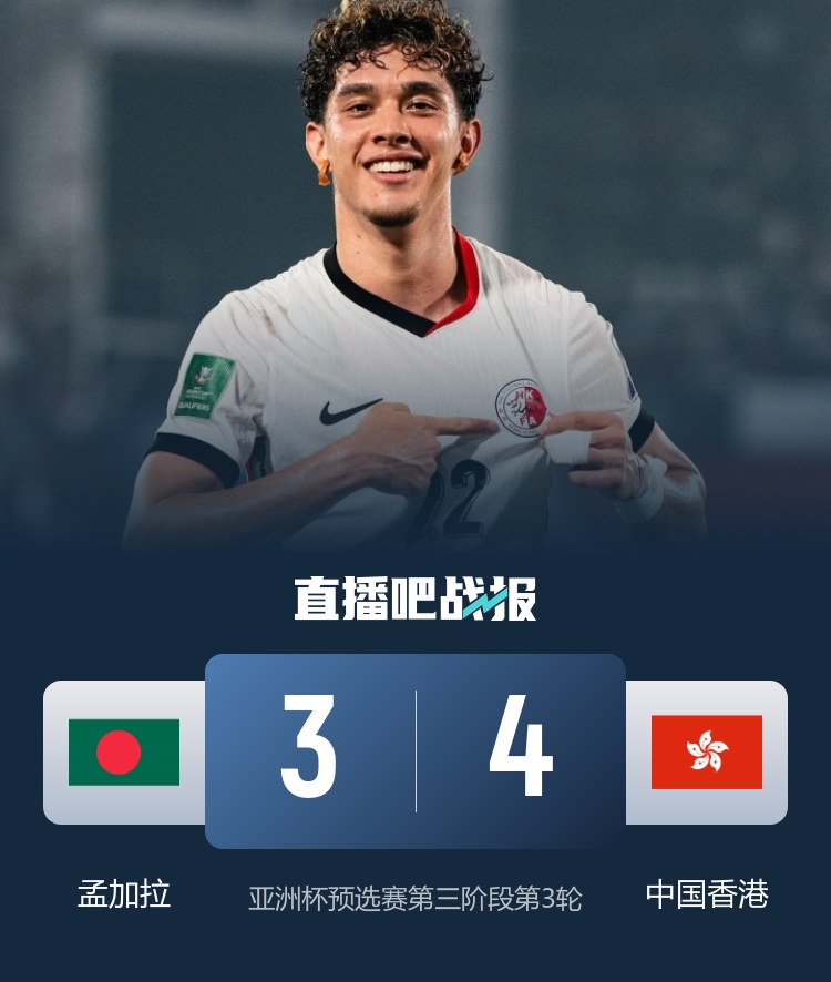 10月09日讯 在刚刚结束的亚洲杯预选赛中,中国香港4-3绝杀孟加拉国,列小组第1。比赛中,泰山球员李小恒替补戴帽完成绝杀,艾华顿完成传射。