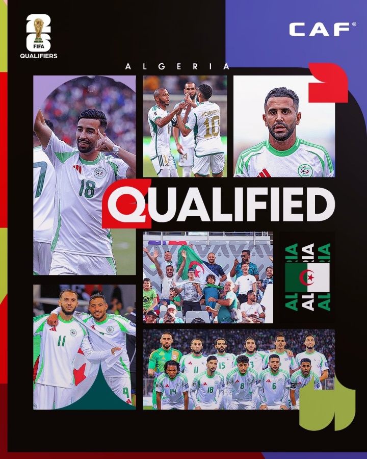 非洲区世预赛,马赫雷斯传射、阿穆拉双响,阿尔及利亚3-0战胜索马里,提前晋级2026世界杯。