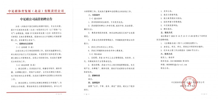 9日晚,中足联官方发布通知,中足联体育发展(北京)有限责任公司公开招聘总经理(1人)、副总经理(2人),共3名高管。而据了解,这只是中足联内部人员调整工作的一部分。中足联接下来将组织一次全面内部人员招聘,招聘岗位不仅限于作为中足联经营机构的中足联公司,还涉及中足联其它相关职能部门,如竞赛、裁判、女子等部门。