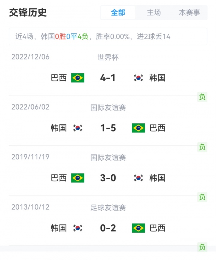 韩国FIFA排名第23,巴西FIFA排名第6。双方上次交手是2022年世界杯淘汰赛,巴西4-1大胜韩国。