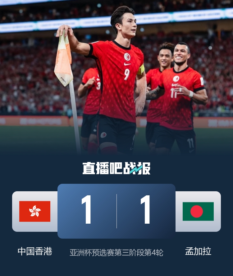 最终1-1的比分被保持到全场结束,中国香港队四战二胜二平积8分,在亚洲杯预选赛C组先赛3分优势领跑。