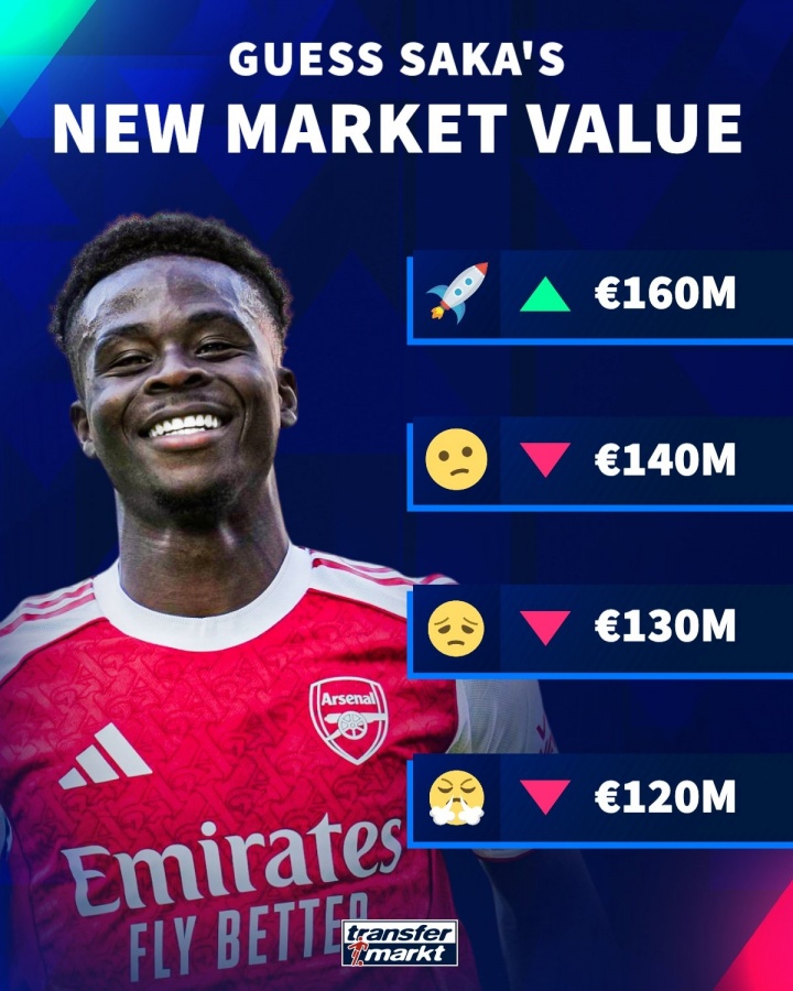 德转给出了萨卡身价变动的四个可能选项,分别是1.6亿欧、1.4亿欧、1.3亿欧和1.2亿欧。目前24岁的萨卡德转身价为1.5亿欧元,这也意味着本次萨卡的身价一定会迎来变化。
